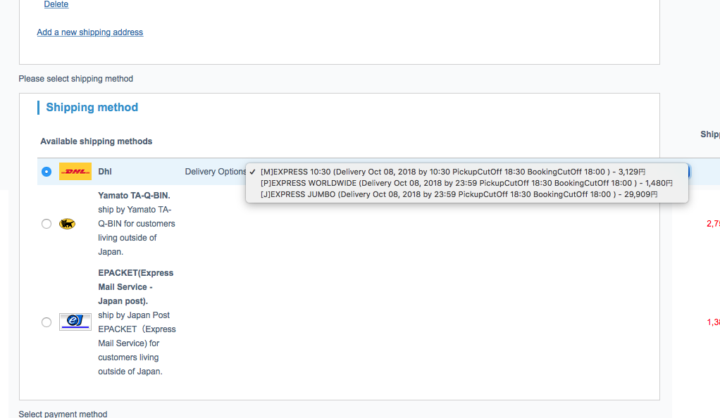 配送方法選択画面でAPI経由で配送料金が表示されます。フューエルサーチャージ込みの金額で計算されます。