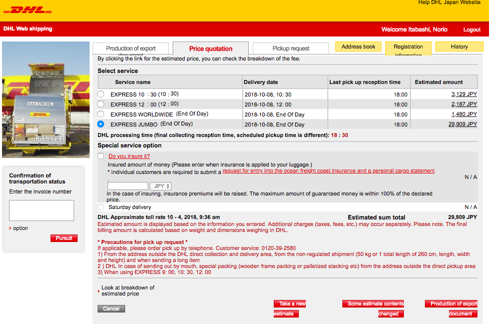 料金計算はDHLの管理画面と完全連動していますが、DHLの管理画面にログインする必要はありません。