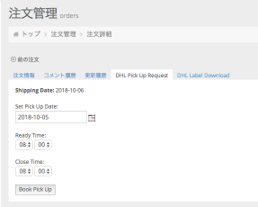 DHLー受注後にDHLへの集荷時間をリクエストする画面です。