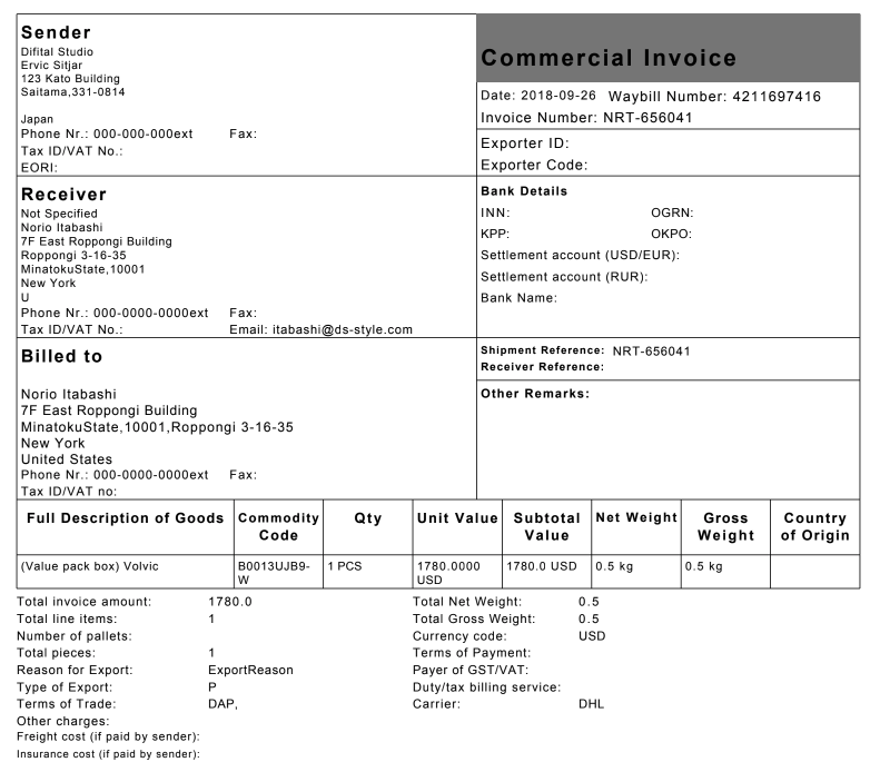 出荷日時が記載されたインボイスと配送ラベルをPDFでダウンロードできます。