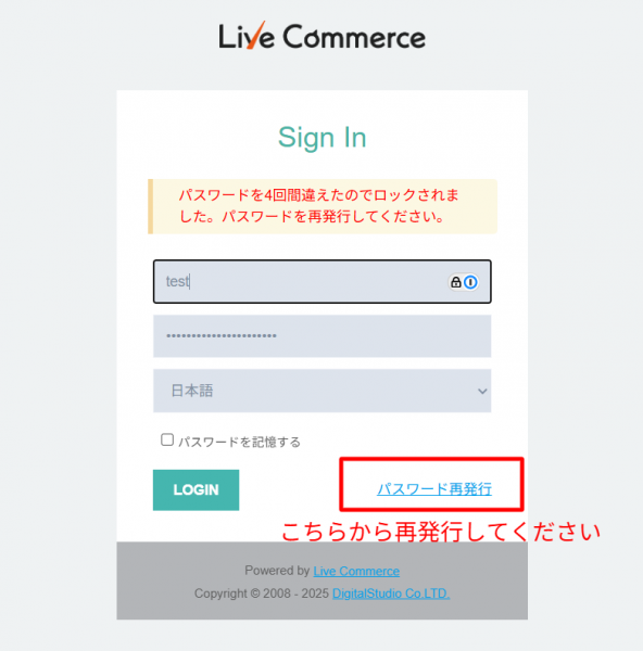 - パスワード入力に4回失敗してしまった場合、こちらからパスワードの再発行を行ってください。