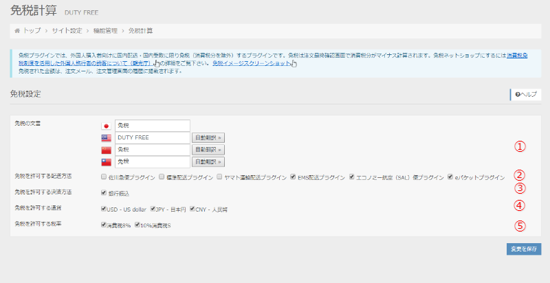- 免税を許可する決済方法 – 免税される決済方法にチェックを入れます。