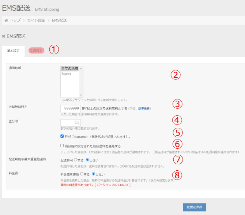 5. EMS InsuranceEMSの保険料金を送料に加算する場合はチェックします。EMS保険は小計額に対して追加されます。また、免税プラグイン利用時の免税額は考慮されません。