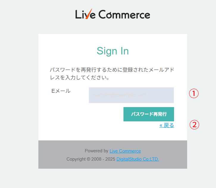- Eメール – ログインで失敗しているメールアドレスを入力してください。入力されたアドレスに新しいパスワードを送付いたします。