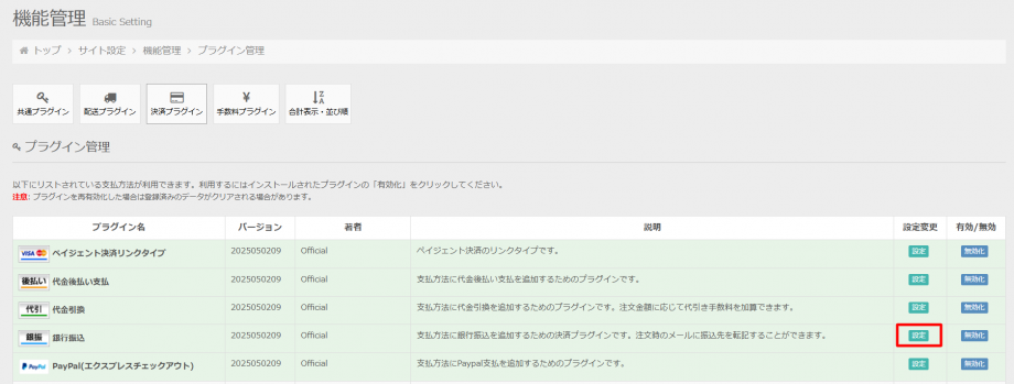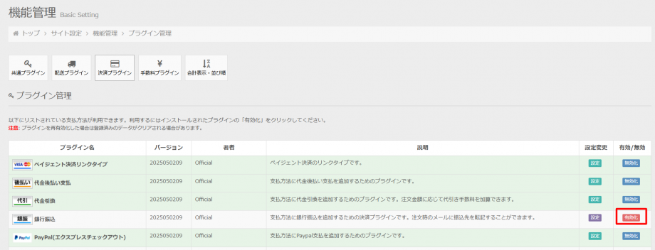 例として、銀行振込プラグインを有効化します。