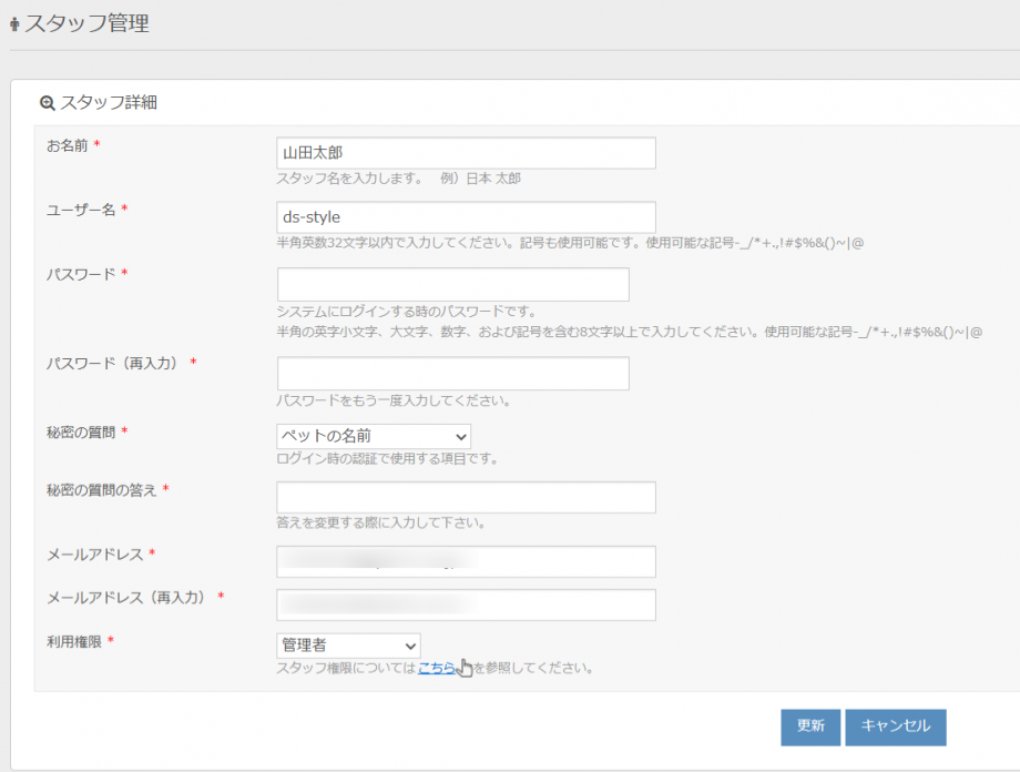 管理画面にログインできるユーザーの新規登録は、スタッフ管理で行います。