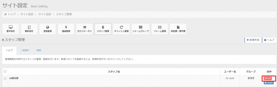 - スタッフ一覧画面で該当のスタッフのEditボタンをクリックします。
