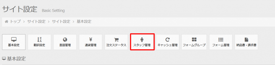 管理画面にログインできるユーザーの設定は、スタッフ管理で行います。