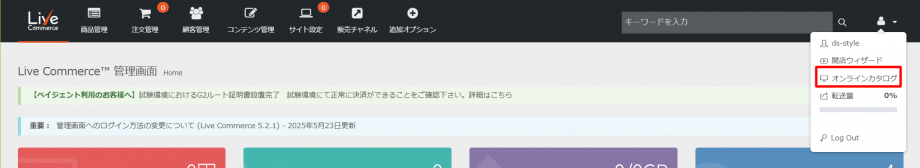 - 管理画面右上のメニューで、オンラインカタログをクリックします。