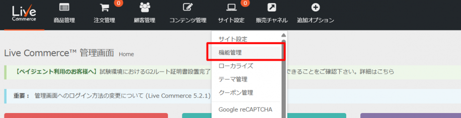 - 管理画面にログインし、トップページ上部のメニューからサイト設定 > 機能管理 をクリックします。