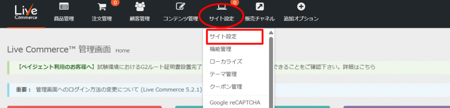 - 管理画面トップページのメニューでサイト設定 > サイト設定 をクリックします。