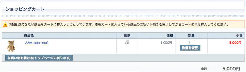 AAAをカートに入れた状態で、BBBをカートに追加しようとすると、以下のようなメッセージが表示されます。