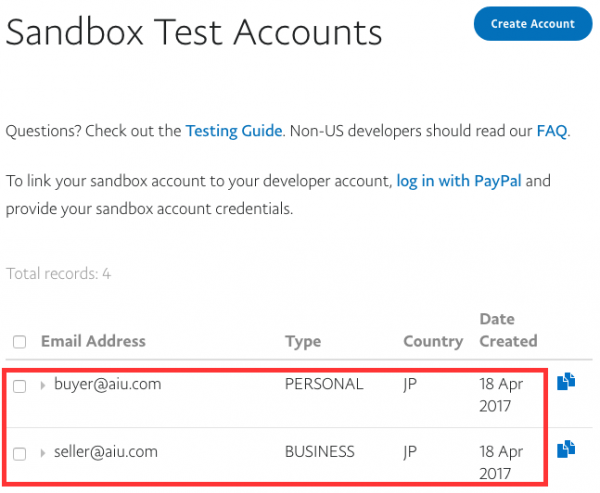 情報を入力してページ下部の[Create Account]ボタンをクリックすると、作成したテストアカウントの一覧が表示されます。
