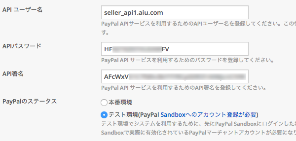 Sandboxで取得したAPI情報(ユーザー名/パスワード/API署名)を入力します。末尾に不要な半角スペースなどがあると、接続エラーとなります。PayPalのステータスは「テスト環境」を選択します。接続URLを変更する必要はありません。