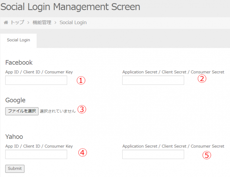 Social Login Feature は SNSを利用したログイン機能です。新たにサイト内に設定をしなくても、SNSを利用して登録済みの情報を受け取ることができます。本サービスを利用するには、ご利用になるそれぞれのサービスに対して、アカウントキーやファイルが必要になります。