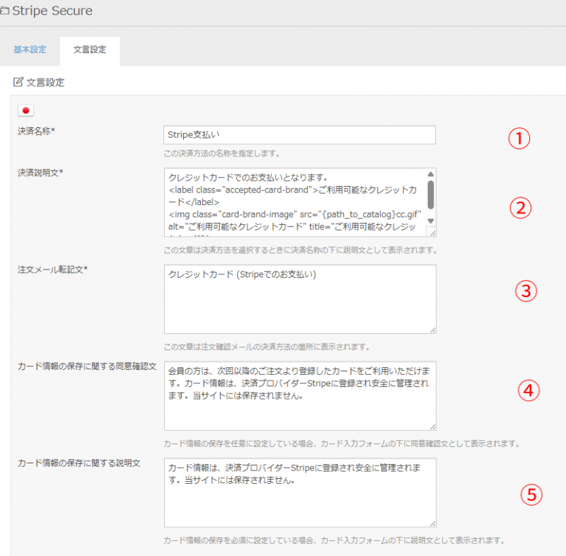 - カード情報の保存に関する同意確認文 – 基本設定の⑮で任意を選択したとき、会員の場合にカタログの④に出力されます。ゲストの場合には、カード番号は保存されないのでこのメッセージは出力されません。
